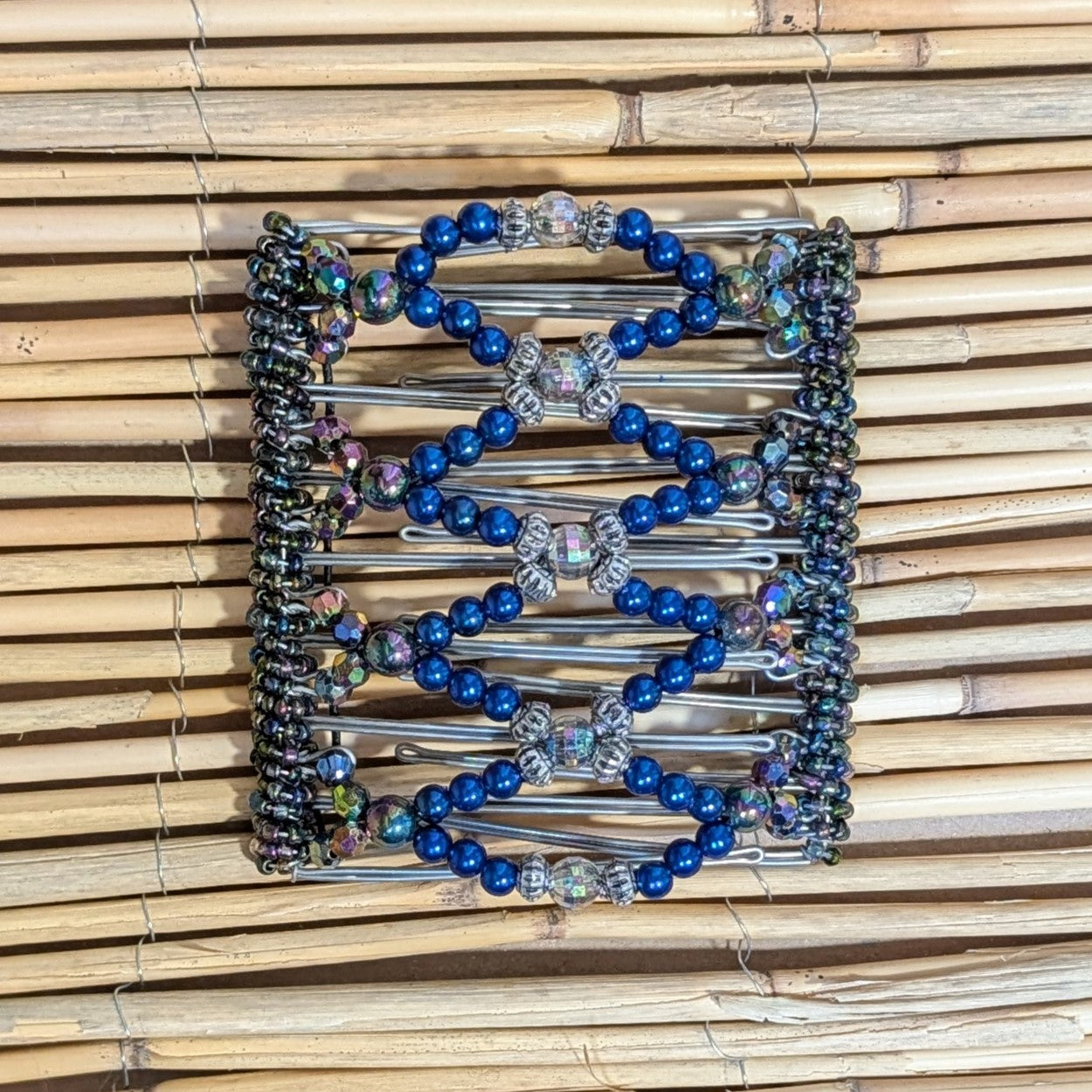 Rhino "Ndalena" groß mit blau-silbernen Kunstperlen mit 9 Zähnen