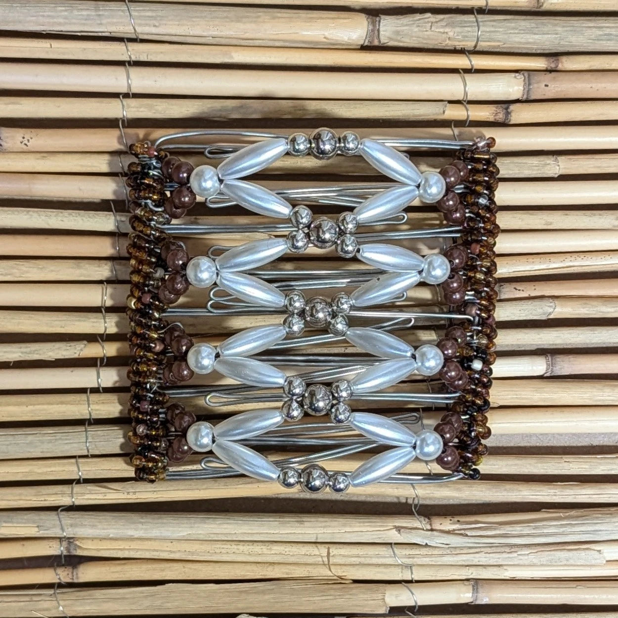 Rhino "Ndalena" groß mit braun-cremefarbenen Kunstperlen mit 9 Zähnen
