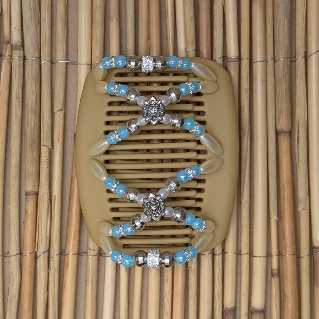 African Butterfly Strass "Ndalena" mit weiß-türkisen Kunstperlen beige